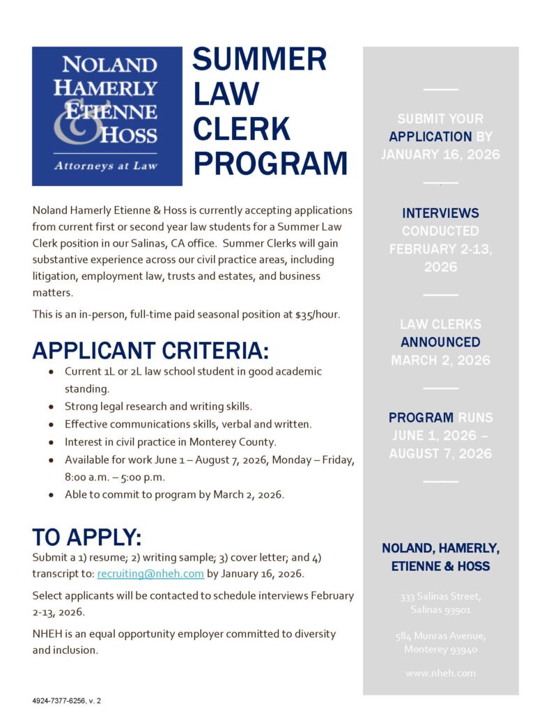 NHEH 2026 Law Clerk Program January 6, 2026 News Share: Facebook | Linkedin | Email Previous NewsDecember 16, 2025NEW CALIFORNIA EMPLOYMENT LAWS FOR 2026October 21, 2025NHEH Monterey Opens New Office with Monterey Peninsula Chamber of Commerce Ribbon CuttingSeptember 19, 2025CEQA Reform—New Laws Eliminate Environmental Review of Certain ProjectsSeptember 16, 2025NHEH Relocates Monterey Office to DowntownJune 10, 2025Yvonne Ascher Honored by Monterey College of Law